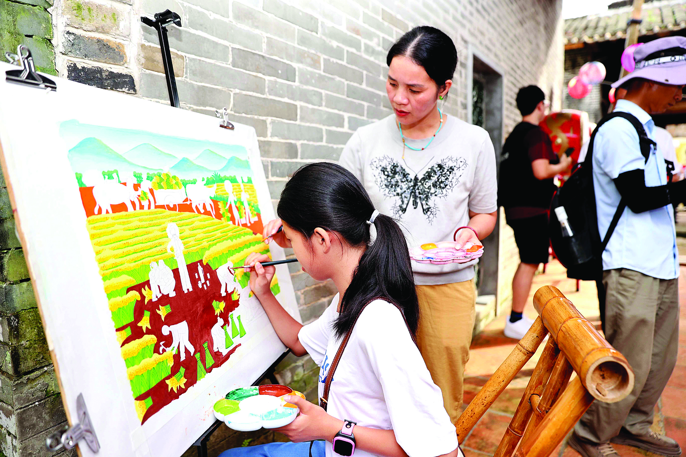 在博羅縣長(zhǎng)寧鎮(zhèn)徐田村新時(shí)代文明實(shí)踐中心,“古韻新徐田·鄰里共未來”的主題活動(dòng)將傳統(tǒng)非遺與現(xiàn)代生活美學(xué)融合。游客們不僅能在徐田藝社、徐田驛市感受“古建新生”的藝術(shù)氣息,還能親手體驗(yàn)中草藥香囊制作、客家涼帽編織、羅浮山艾粄制作、剪紙、手工花燈等非遺技藝,或在秋收市集中尋覓地道風(fēng)物。
