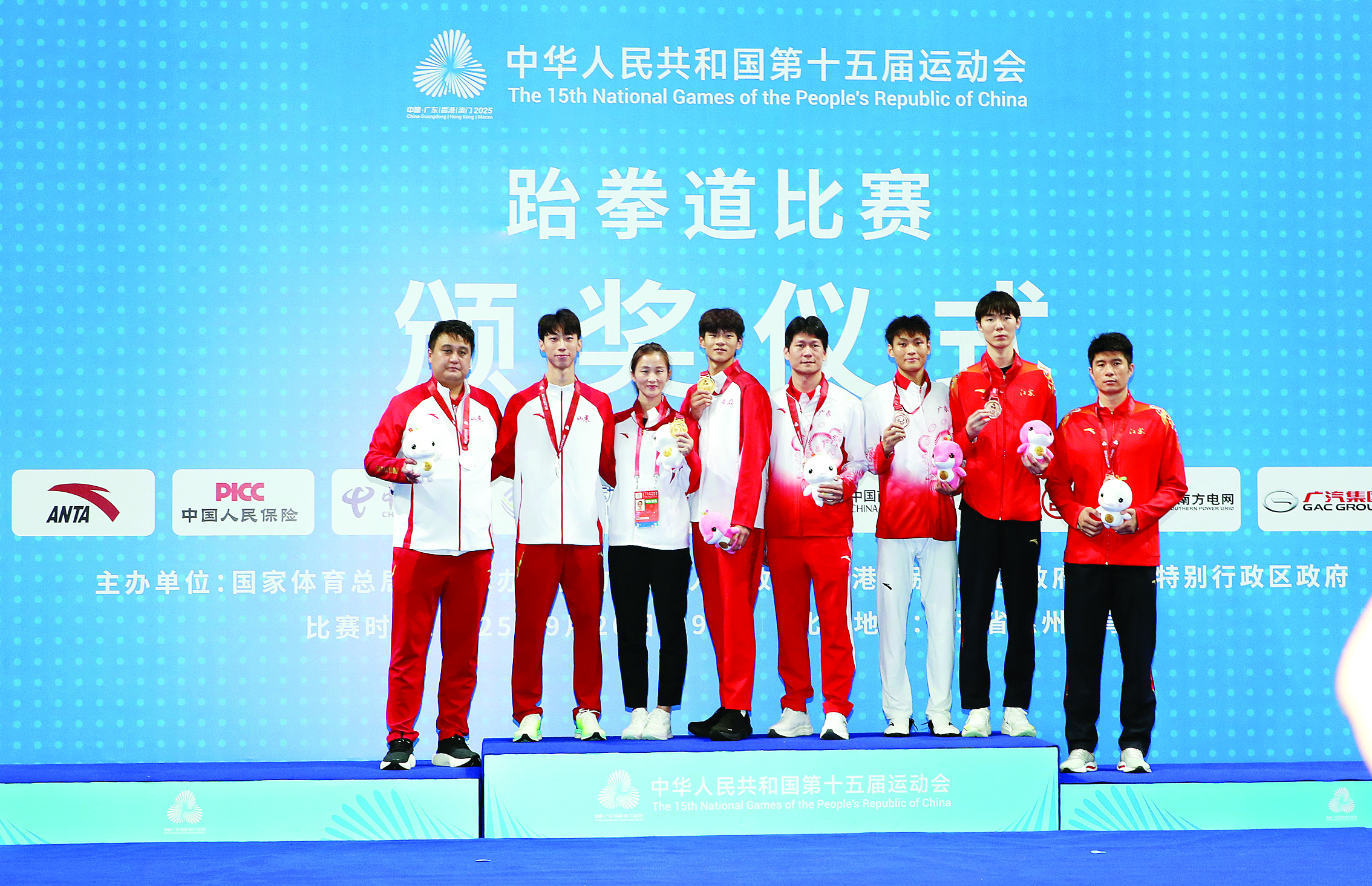 獲得跆拳道男子68公斤級(jí)前三名的選手和教練員上臺(tái)領(lǐng)獎(jiǎng)。 惠州日?qǐng)?bào)記者鐘暢新 攝