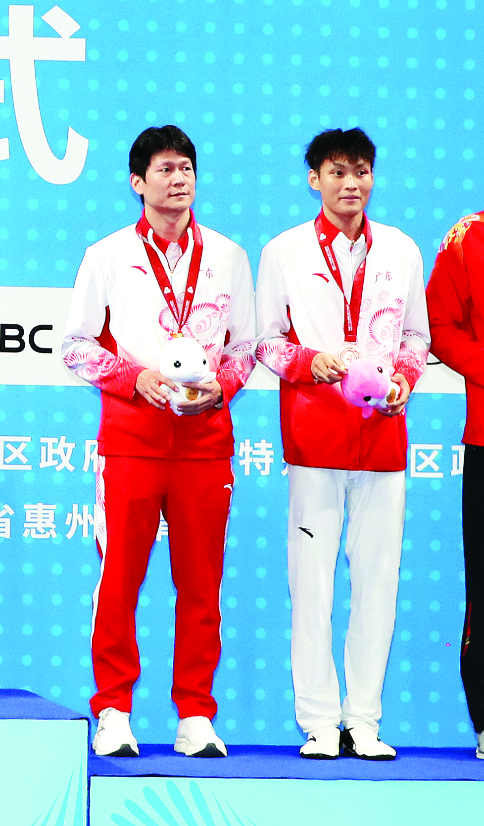 廣東隊(duì)選手嚴(yán)磊(右)和教練上臺(tái)領(lǐng)獎(jiǎng)。 惠州日?qǐng)?bào)記者鐘暢新 攝