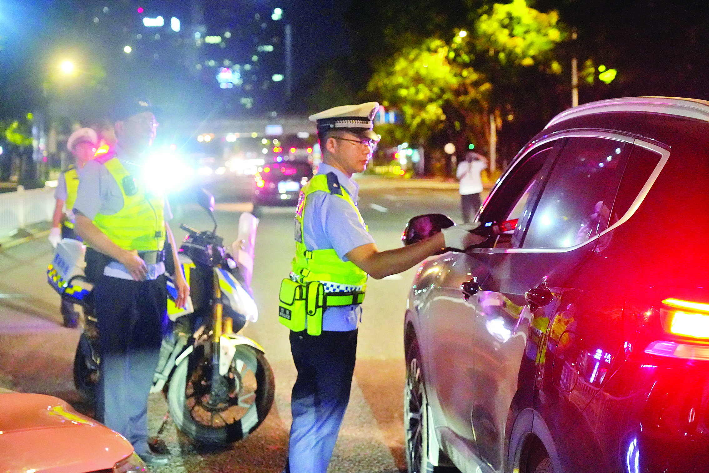 “先生,麻煩你停車接受檢查!薄澳愫,騎電動車要規(guī)范佩戴安全頭盔!薄袆又校槍榘讣喟l(fā)、治安復雜的區(qū)域、路段,惠州公安共設立綜合查緝、巡查管控、交通整治等卡點124處,消除交通安全與社會治安隱患,全力營造安全、暢通、有序的公共環(huán)境。