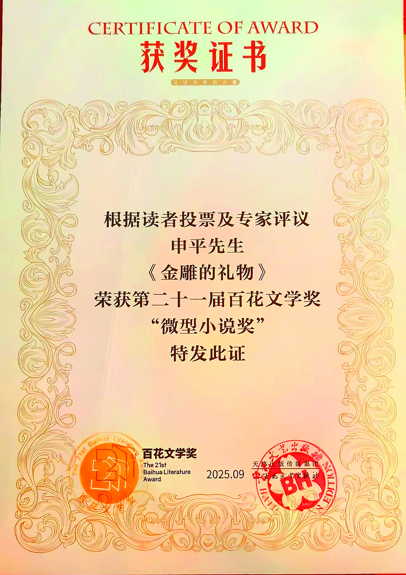 惠州日報(bào)訊 (記者龔妍)9月20日,第二十一屆百花文學(xué)獎(jiǎng)?lì)C獎(jiǎng)典禮在天津舉行,45部優(yōu)秀作品分獲8類文學(xué)獎(jiǎng)項(xiàng),27位編輯獲編輯獎(jiǎng),30位讀者獲讀者獎(jiǎng)。我市一級作家申平作品《金雕的禮物》,獲得微型小說獎(jiǎng)。