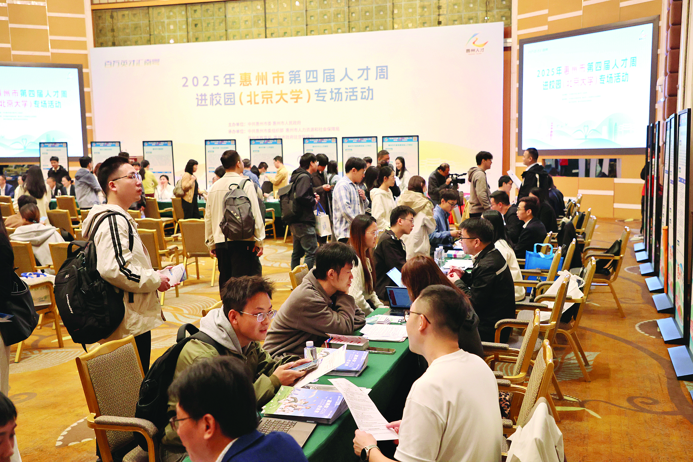 10月15日,由市委、市政府主辦,市委組織部、市人力資源和社會保障局、市教育局、市政府駐京聯(lián)絡(luò)處承辦的“百萬英才匯南粵”暨2025年惠州市第四屆人才周進校園(北京)專場活動走進北京大學(xué)。圖為我市民營企業(yè)招聘的崗位受到了北大學(xué)子的青睞;葜萑請笥浾咄踅 攝