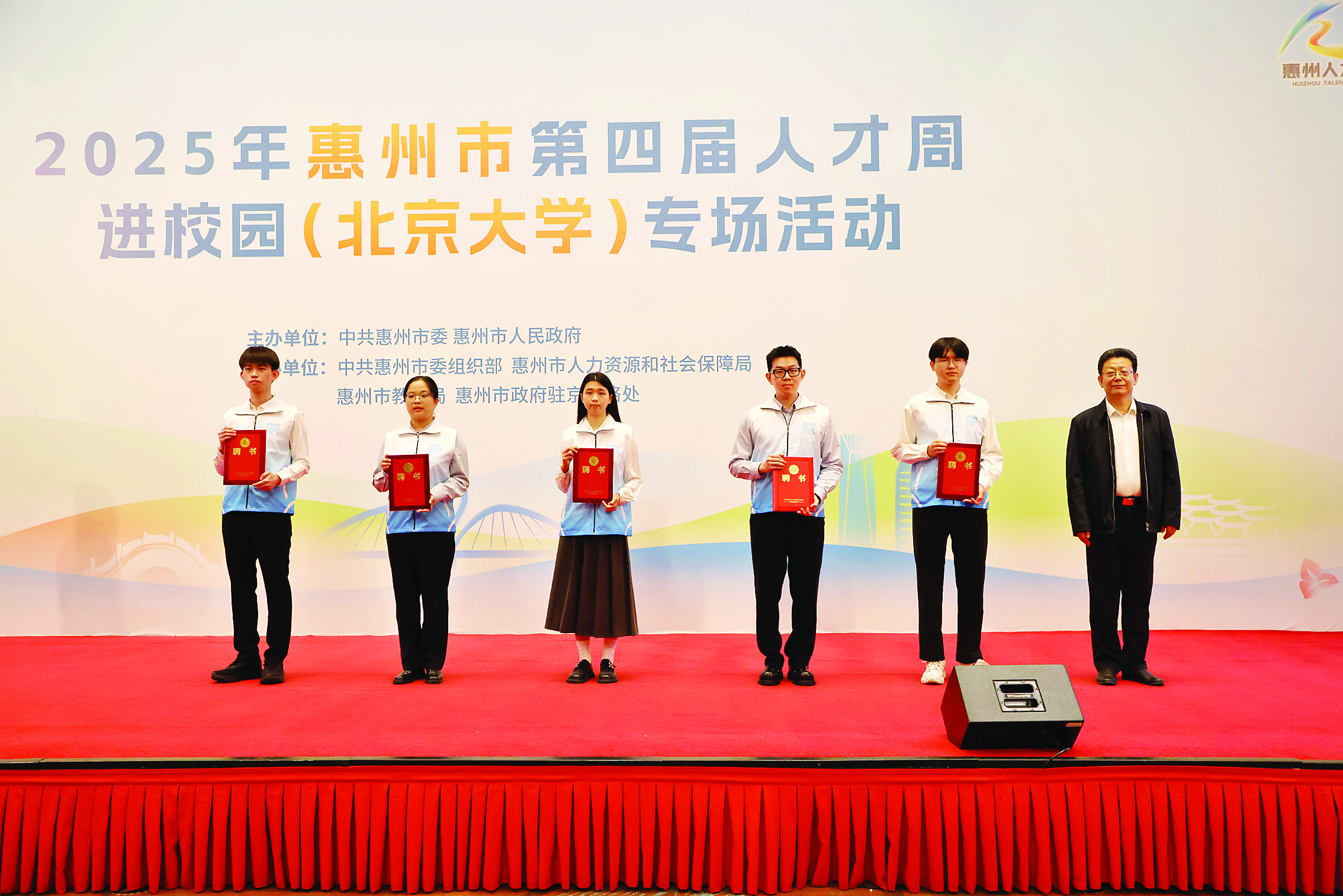 為惠州籍北大學(xué)子頒發(fā)“校園引才大使”證書;葜萑?qǐng)?bào)記者王建橋 攝