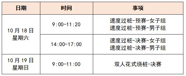 自由式輪滑設男子速度過樁、女子速度過樁、自由式輪滑混合雙人花式繞樁,執(zhí)行世界輪滑聯(lián)合會最新《自由式輪滑競賽規(guī)則》,因傷病原因棄權的選手,按照該選手最后完成的比賽輪次成績排名;無故棄權,取消棄權選手的所有比賽成績。