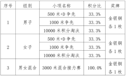 速度輪滑男子團體積分賽、速度輪滑女子團體積分賽排名辦法按各小項名次積分之和排序,各小項第1-8名分別按9、7、6、5、4、3、2、1計算得分;獲第9名及之后名次的運動員得1分。如團體積分相等,冠軍多者列前,冠軍數(shù)相等,亞軍多者列前,以此類推。