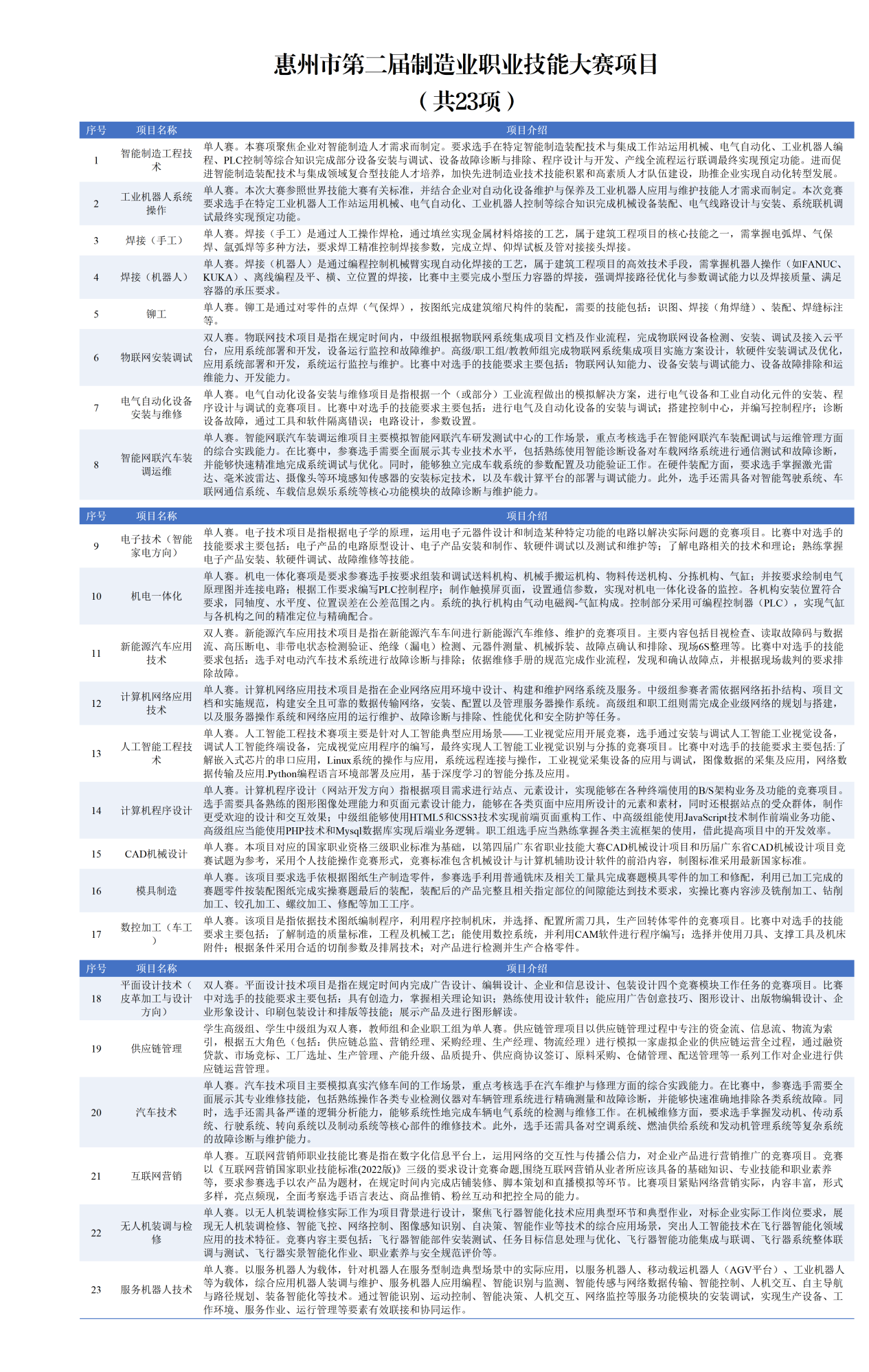 大賽緊密圍繞我市制造業(yè)當家戰(zhàn)略,聚焦制造業(yè)與電子信息產業(yè)、新能源與新型儲能產業(yè)、數(shù)據中心、未來產業(yè)與新興產業(yè)、傳統(tǒng)產業(yè)轉型升級,共設置23個競賽職業(yè)(工種)或項目,覆蓋惠州重點發(fā)展產業(yè)集群。