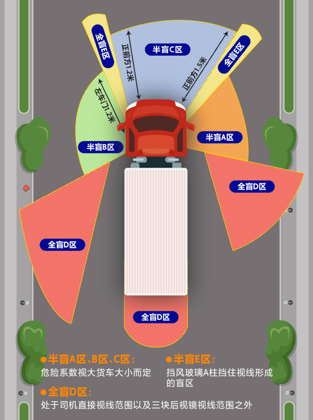 大型車車頭較高,駕駛員視線與地面形成的角度較大,車頭正前方約2-3米范圍內(nèi)、尤其是貼近車身的區(qū)域,駕駛員難以直接觀察到,若有行人或小型車輛停留,極易引發(fā)碰撞。