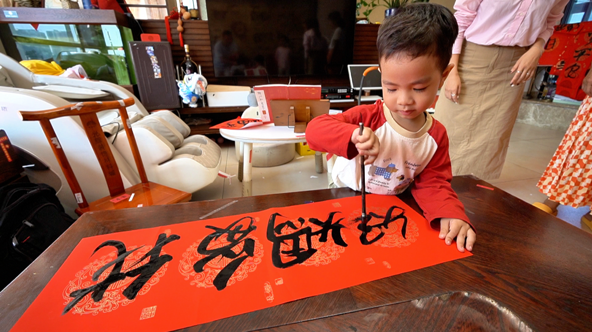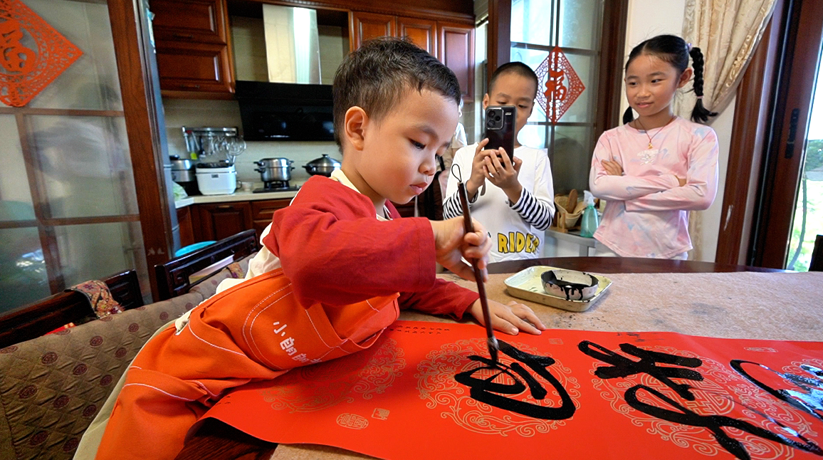 “吉祥如意好意來!”紅紙上,小手攥著毛筆翻飛,3歲的黃煊朗(小名朗朗)踮著腳站在椅子上,半個身子撲在餐桌前,蘸墨、落筆一氣呵成。雖握筆是幼齡寶寶常見的“握拳式”,但筆畫粗細有別、間架結構規(guī)整,寫完上聯(lián)寫下聯(lián),最后補上橫批和“福”字,一套春聯(lián)“四件套”才算收尾——這份專注與功底,不僅讓央視《越戰(zhàn)越勇》的主持人連連驚嘆,更讓億萬網(wǎng)友直呼“文曲星下凡”。
