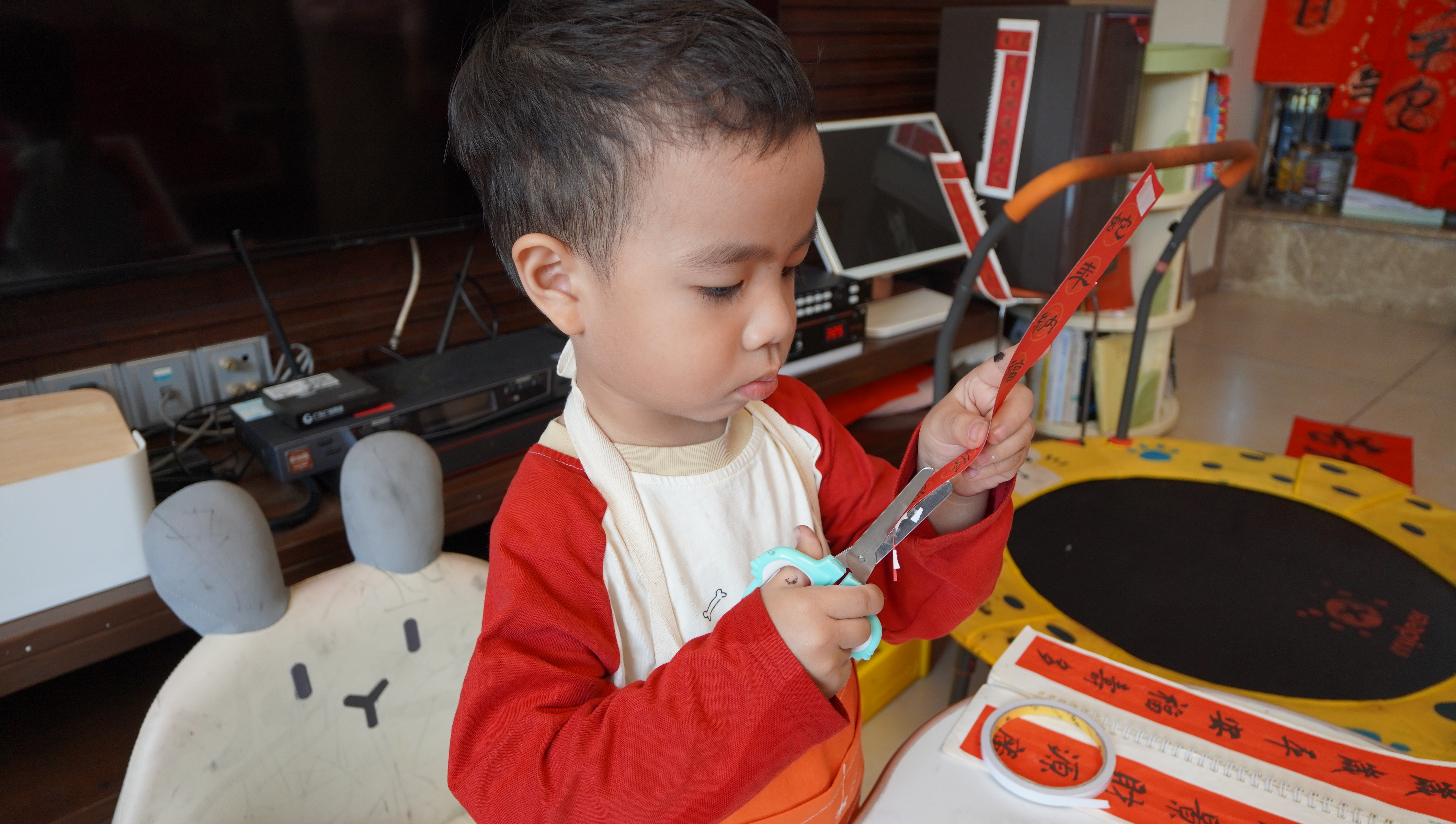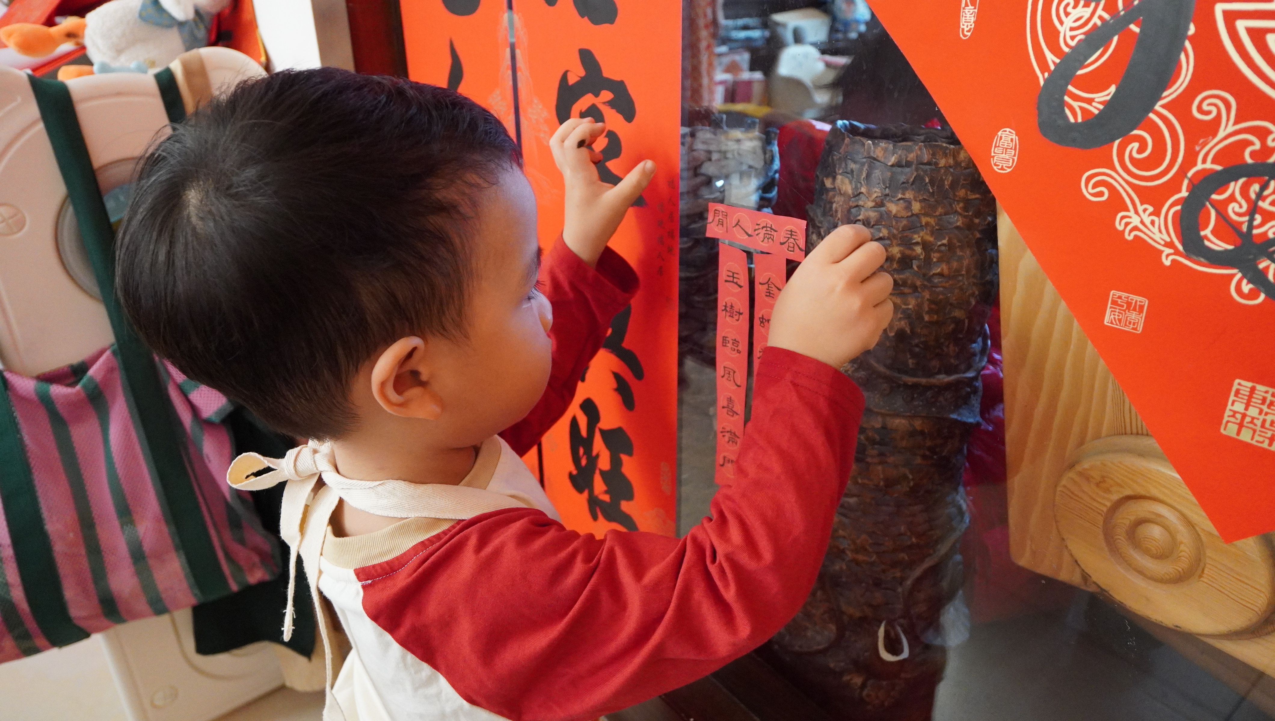 走進朗朗家,仿佛闖入了“對聯(lián)天地”:房門、柜子上貼滿對聯(lián),地上鋪著他上午剛寫就的新聯(lián),玩具架、餐廳扶手旁堆著厚厚幾疊對聯(lián)紙,客廳茶幾上常年擺放著文房四寶,隨時供他即興創(chuàng)作。初見記者時,這個長著小方腦袋系著小圍兜的萌娃還略有認生,摟著媽媽的脖子不放,但一會功夫,媽媽就把他哄來“寫春聯(lián)”。