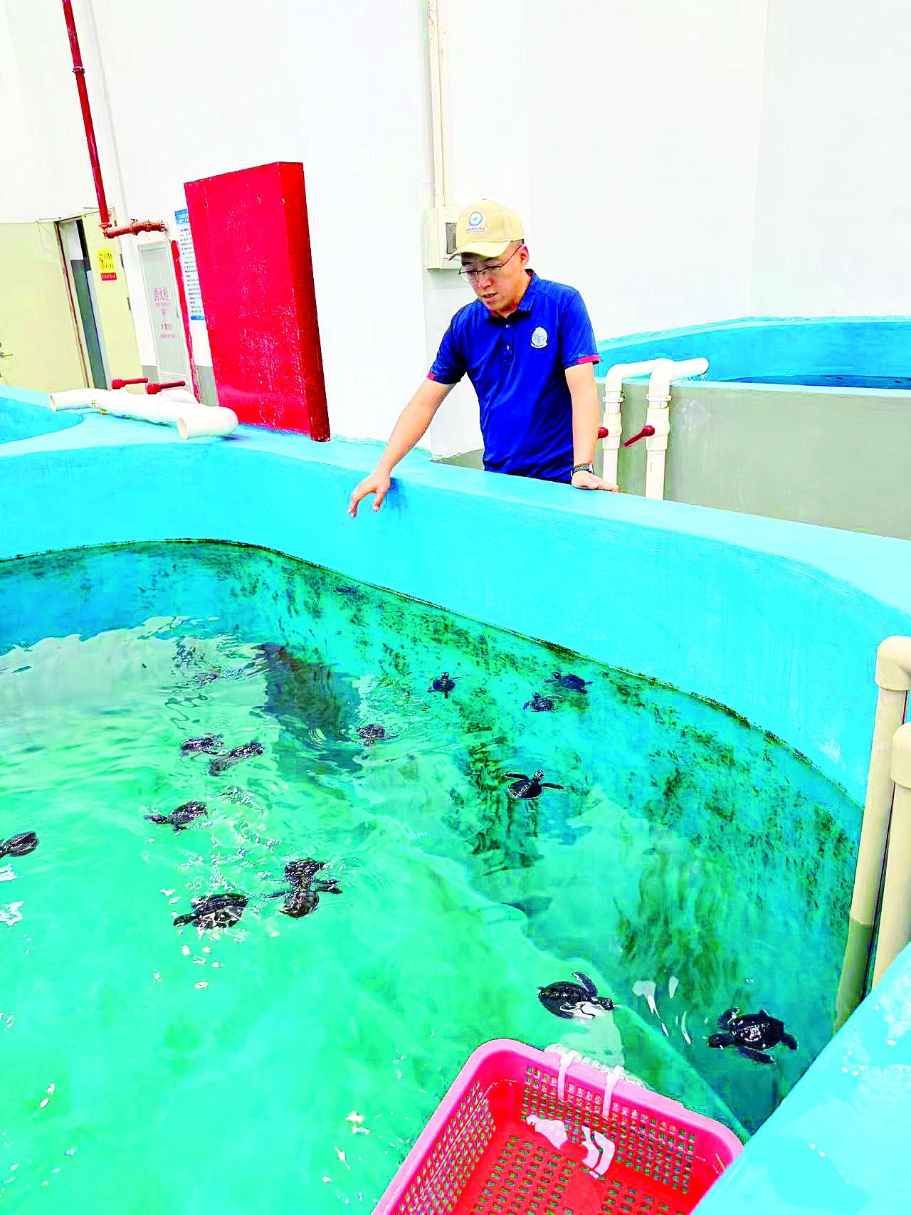 那么他是如何從一個海缸養(yǎng)殖愛好者變成工程師呢?“2018年,我跟一位老板來海龜灣工作,與保護區(qū)交流頻繁,他們知道了我對海水養(yǎng)殖方面有很深的研究!毙ざㄜ娬f,經(jīng)過多年的觀察和配合,他于2021年正式被廣東惠東港口海龜國家級自然保護區(qū)聘用,主要負(fù)責(zé)海龜幼苗的養(yǎng)殖。