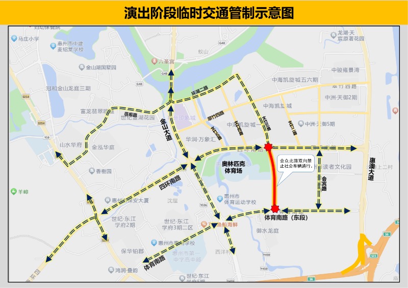 12月18日,記者從惠州市公安局交管支隊(duì)獲悉,12月20日(本周六)18:45至19:30,21:00至22:15(2025年張韶涵覓光世界巡回演唱會期間),市區(qū)金山大道(環(huán)湖二路-體育南路段)、四環(huán)南路(冷水坑掉頭口-文竹三路段)、會眾北路雙向禁止社會車輛通行;體育南路(金山大道-會眾北路段)東往西方向禁止社會車輛通行。