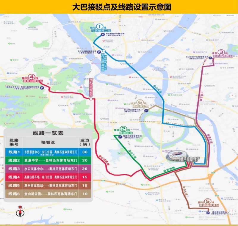 演唱會當(dāng)天,市區(qū)設(shè)置6條大巴車接駁線路。其中,線路1為江北街道市民服務(wù)中心、東江公園停車場(文昌二路公交站)往返奧林匹克體育場東門;線路2:為南岸街道惠港中學(xué)停車場往返奧林匹克體育場東門;線路3為水口街道文化體育中心停車場往返奧林匹克體育場東門;線路4為龍豐街道高榜山停車場、南門公園往返奧林匹克體育場東門;線路5為三棟鎮(zhèn)惠州南高鐵站(文思一路)往返奧林匹克體育場東門;線路6為河南岸街道金山湖公園停車場往返奧林匹克體育場東門。