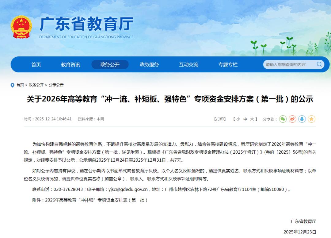 據(jù)公示消息,為加快構建自強卓越的高等教育體系,不斷提升高校對高質量發(fā)展的支撐力、貢獻力,結合各高校建設情況,廣東省教育廳研究制定了2026年高等教育“沖一流、補短板、強特色”專項資金安排方案(第一批,詳見附表)。現(xiàn)根據(jù)《廣東省省級財政專項資金管理辦法(2025年修訂)》(粵府〔2025〕56號)的有關規(guī)定,對經(jīng)費安排予以公示,公示期自2025年12月24日至2025年12月31日,共7天。