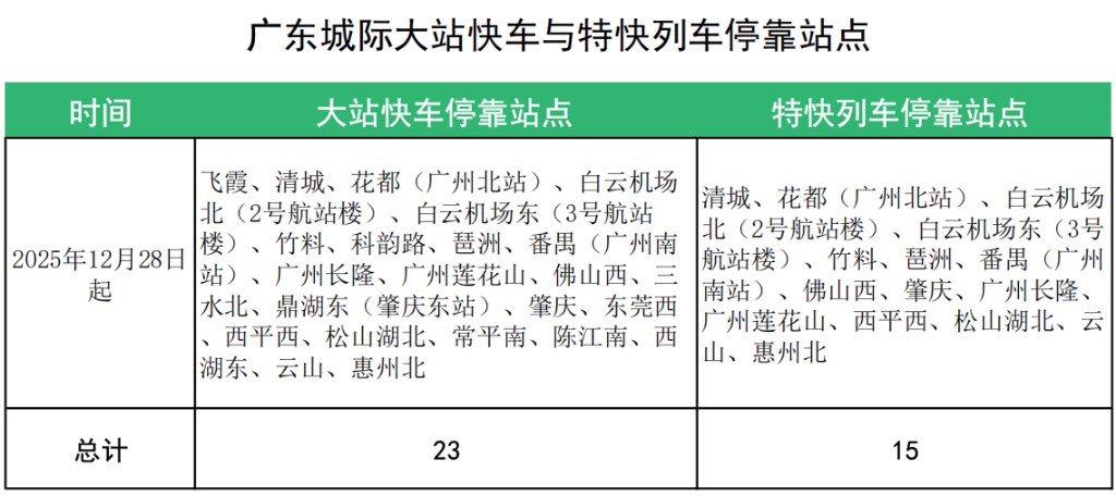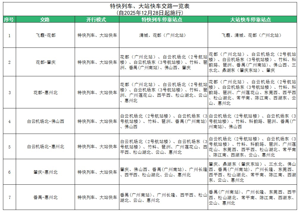 此次運(yùn)行圖調(diào)整主要是增加“白云機(jī)場(chǎng)北-惠州北”特快列車、大站快車交路,新增竹料站為特快列車、大站快車?奎c(diǎn);站站停交路“飛霞-竹料”調(diào)整為“飛霞-花都”“花都-竹料”,廣清城際鐵路沿線的旅客若需前往其他城際線路可通過(guò)花都站進(jìn)行換乘。