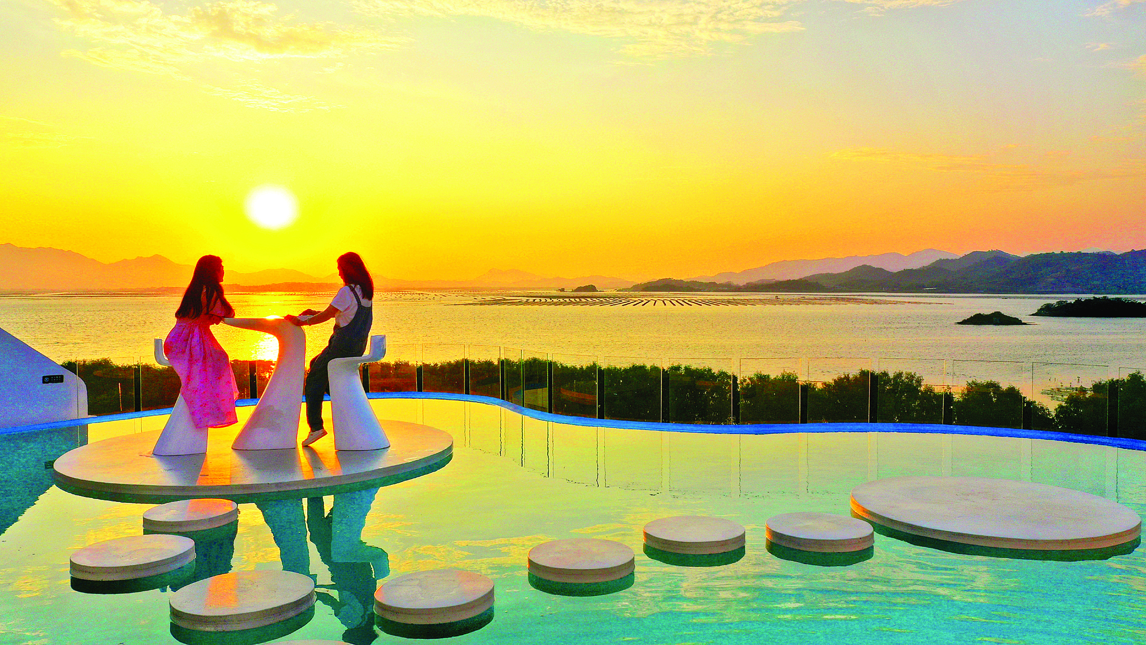游客打卡惠東雙月灣礁石酒吧。惠州東江圖片社供圖