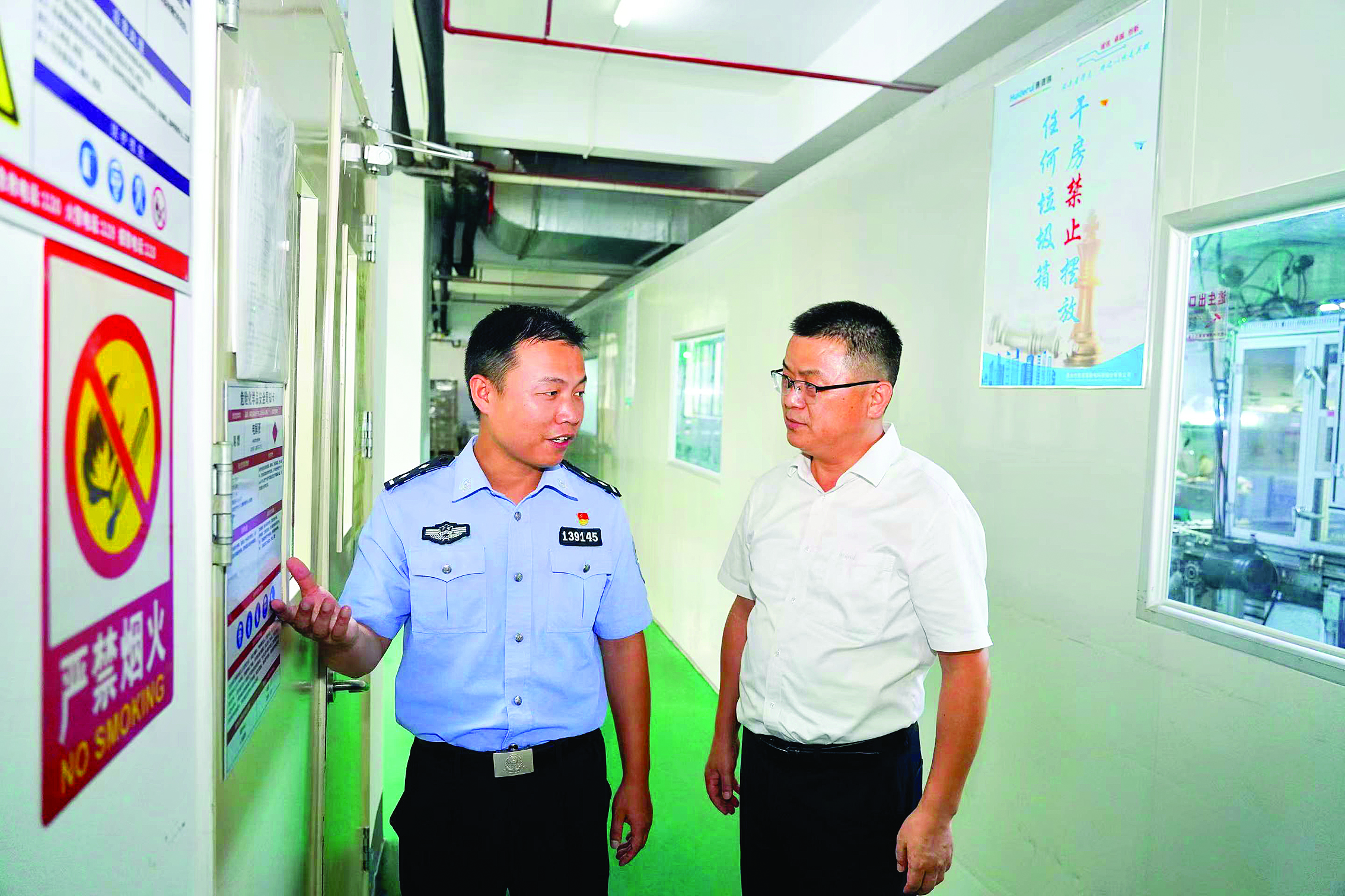 鄒燎原(左)到轄區(qū)企業(yè)開展安全防范提醒。