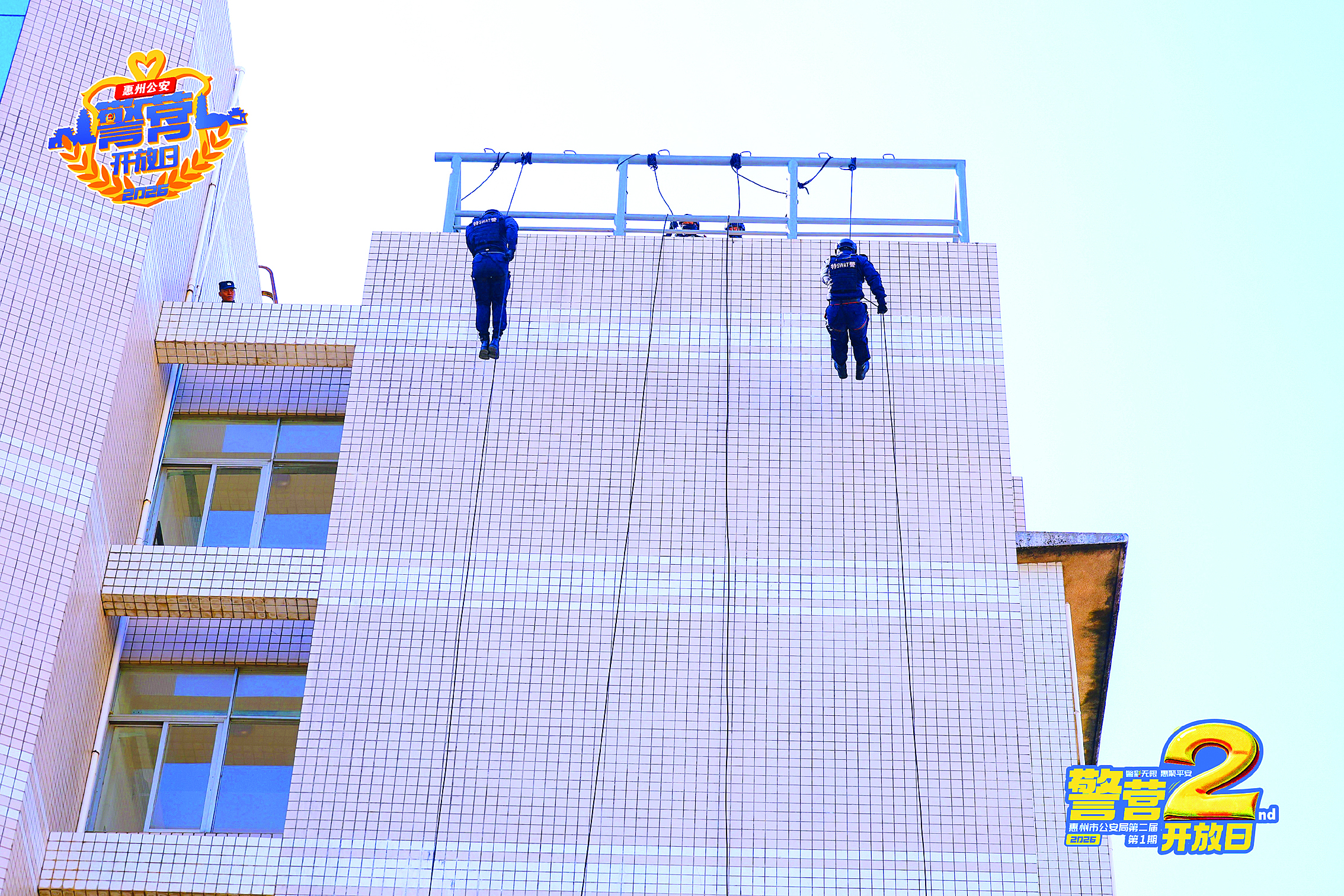 特警表演高空索降。