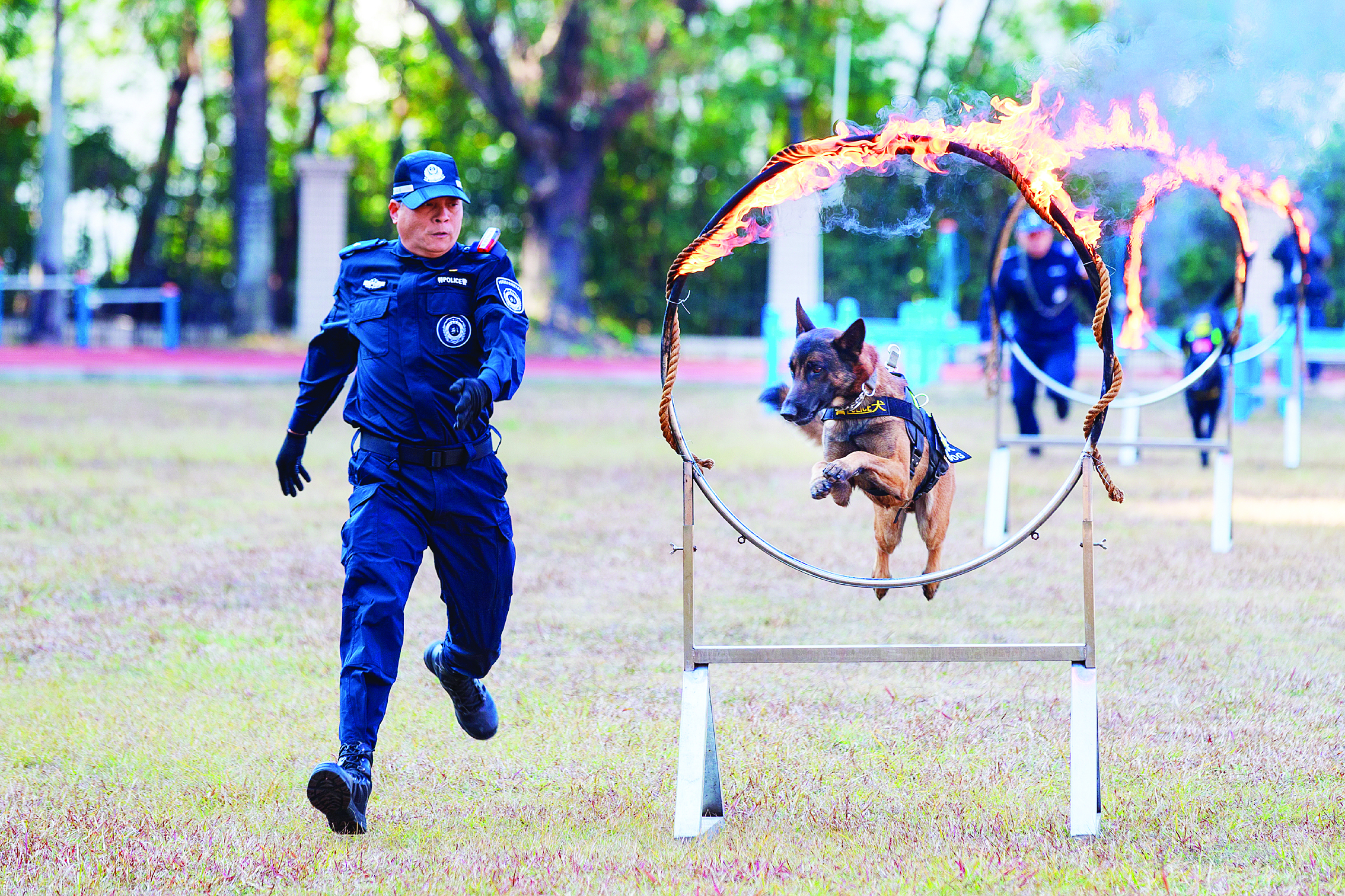 警犬表演鉆火圈。