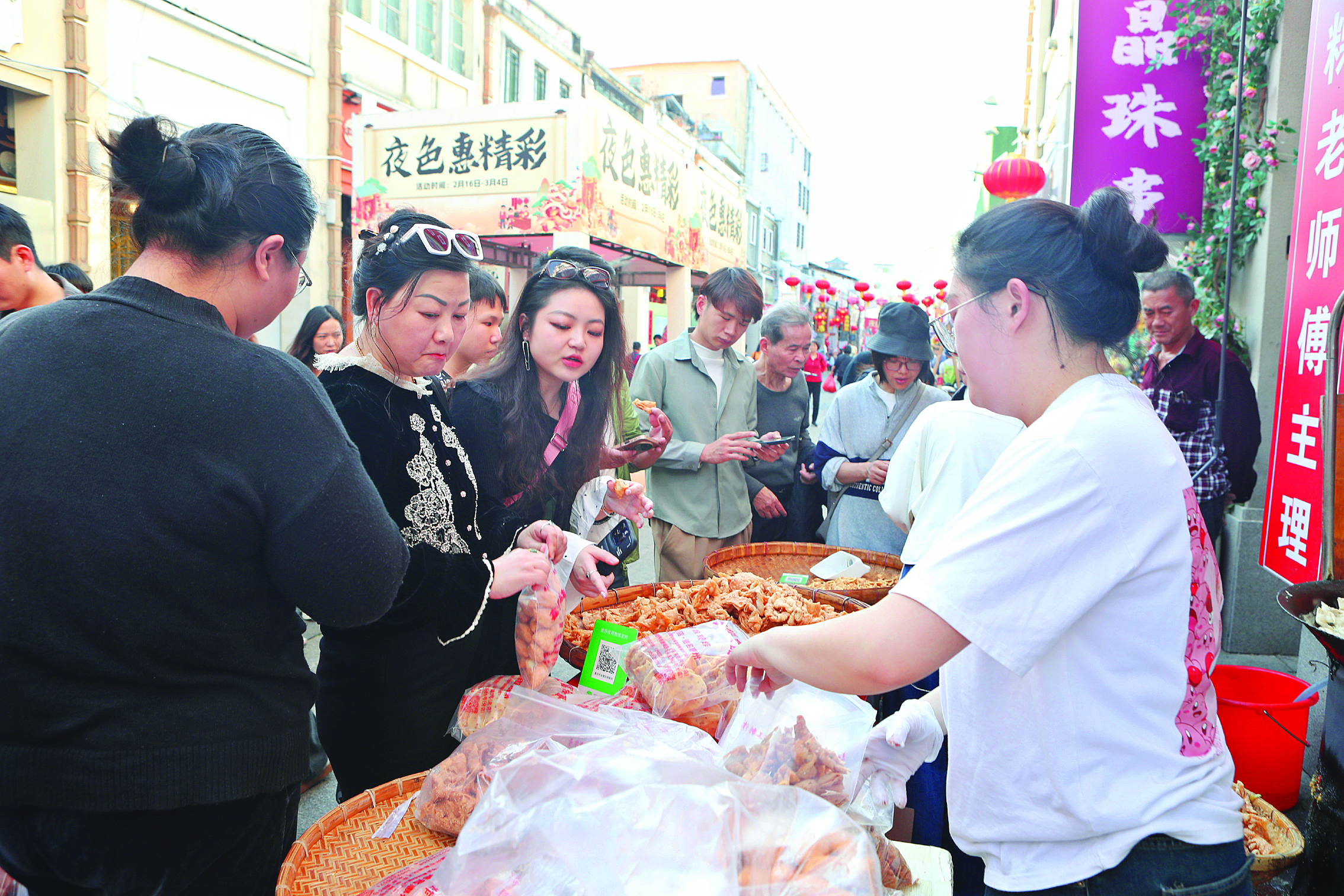 除了水東街,惠城區(qū)橋西市場、步行街的年貨小吃攤位前同樣人氣爆棚。橋西市場入口處,幾家售賣蛋散、鐵勺餅的攤位前,試吃、稱重、打包的市民絡(luò)繹不絕!懊磕甓假I,老惠州人的最愛,既能自家吃,也能當伴手禮送人!笔忻駝⒁桃淮涡再I了五份,她說,這些手工小吃承載著自己從小到大的春節(jié)記憶,少了它們,年就少了幾分滋味。