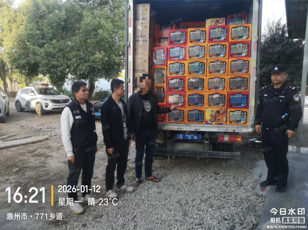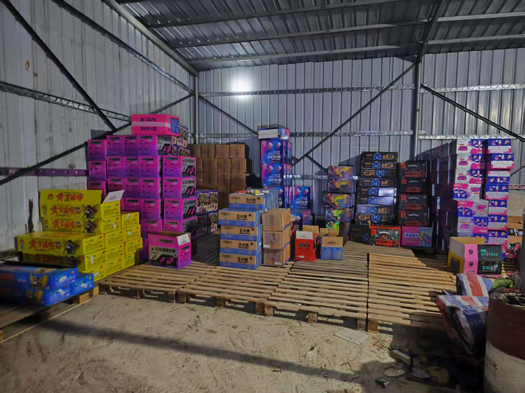 2026年1月12日,惠州市公安局惠陽分局治安大隊聯(lián)合良井派出所在惠陽區(qū)良井鎮(zhèn)山井村202縣道滿江紅煙花爆竹門店旁板房及其對面貨柜廂內(nèi)查獲非法儲存的煙花爆竹896件。經(jīng)查,違法人員劉某某對非法儲存煙花爆竹的違法事實供認不諱,公安部門依法對劉某某處以行政拘留5日。