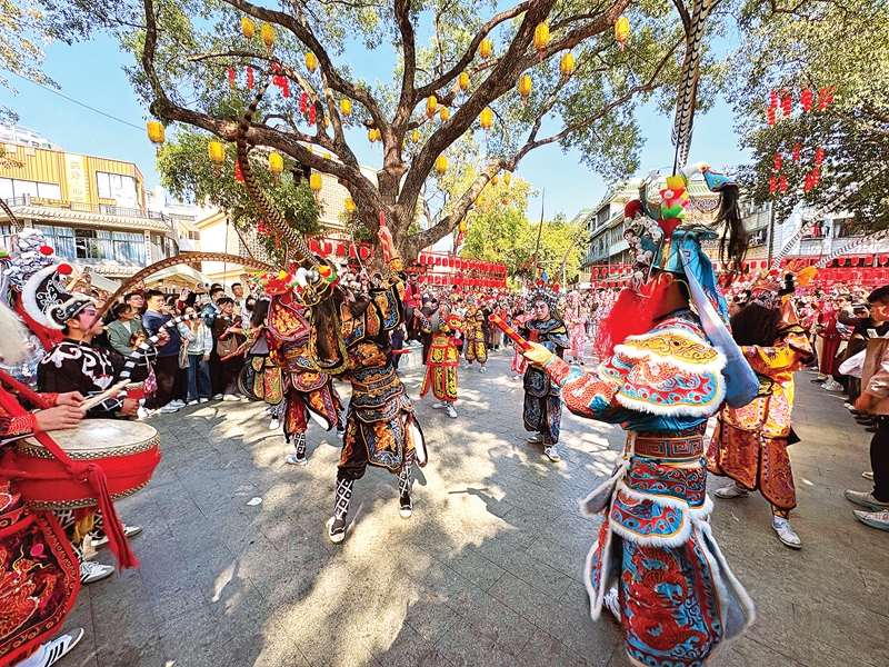 歡聲笑語中,親子同樂暖意融融;葜菔袃和珗@鑼鼓喧天,醒獅騰躍起舞、梅花樁表演驚險精彩,巡游的醒獅為商戶采青送福,家長抱著孩子摸獅頭沾喜氣,每個角落都洋溢著孩童的歡呼與家庭的幸福。