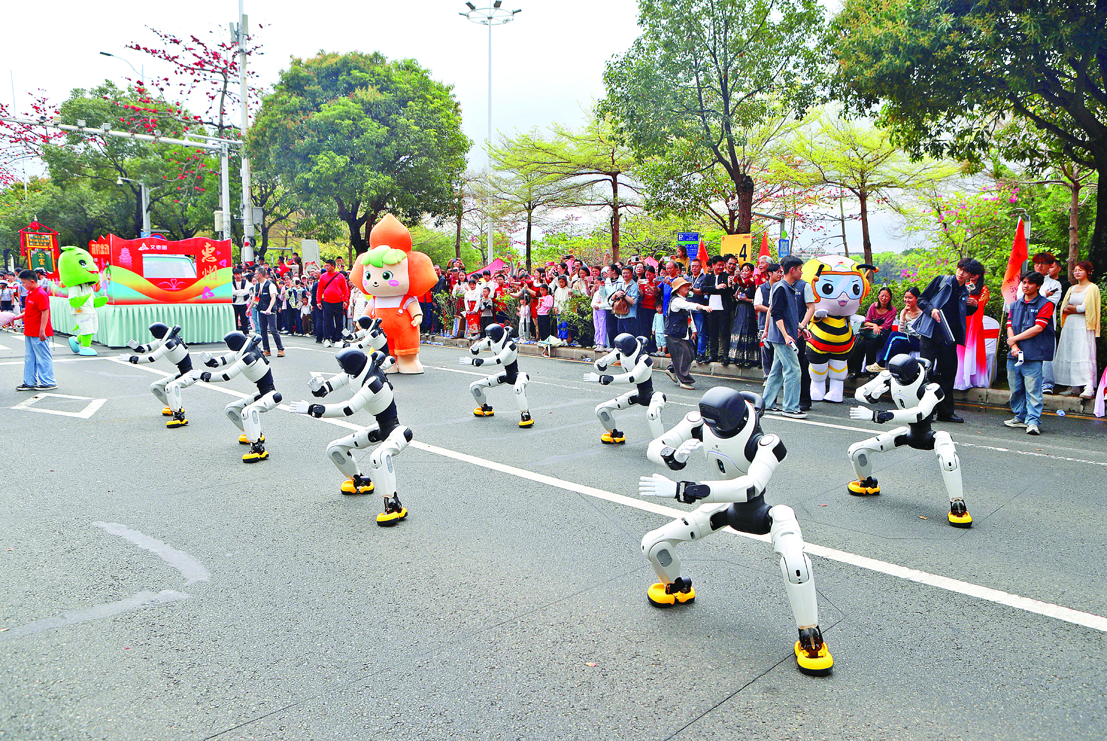 “萌機(jī)出動(dòng)”這支由惠州各單位文創(chuàng)人偶與智元機(jī)器人組成的隊(duì)伍,以科技質(zhì)感碰撞民俗萌態(tài)。只見(jiàn)智元機(jī)器人一下舞出太極拳,一下表演醒獅動(dòng)作,將傳統(tǒng)技藝與現(xiàn)代科技完美融合,既展現(xiàn)惠州打造人工智能和機(jī)器人產(chǎn)業(yè)的雄心,更呈現(xiàn)科創(chuàng)與民俗共生、傳統(tǒng)與現(xiàn)代交融的城市魅力。