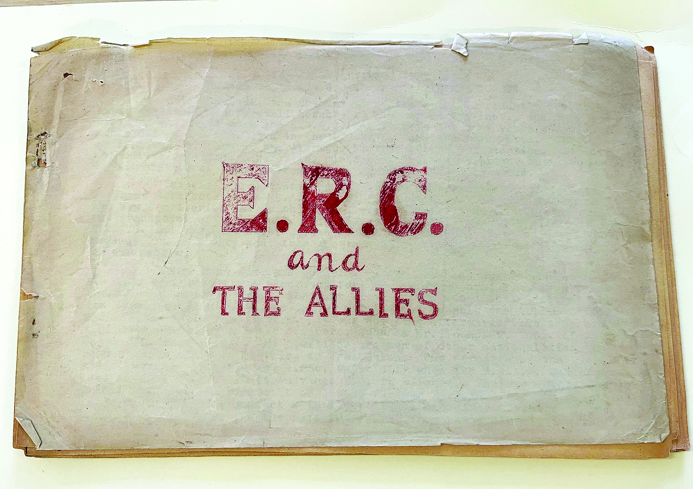 這是一本普通信紙大小、紙張泛黃發(fā)黑的筆記,封面用紅字寫著《東江縱隊(duì)與盟軍》。這份檔案未經(jīng)裝訂,只用別針夾著,頁邊已脆化。
