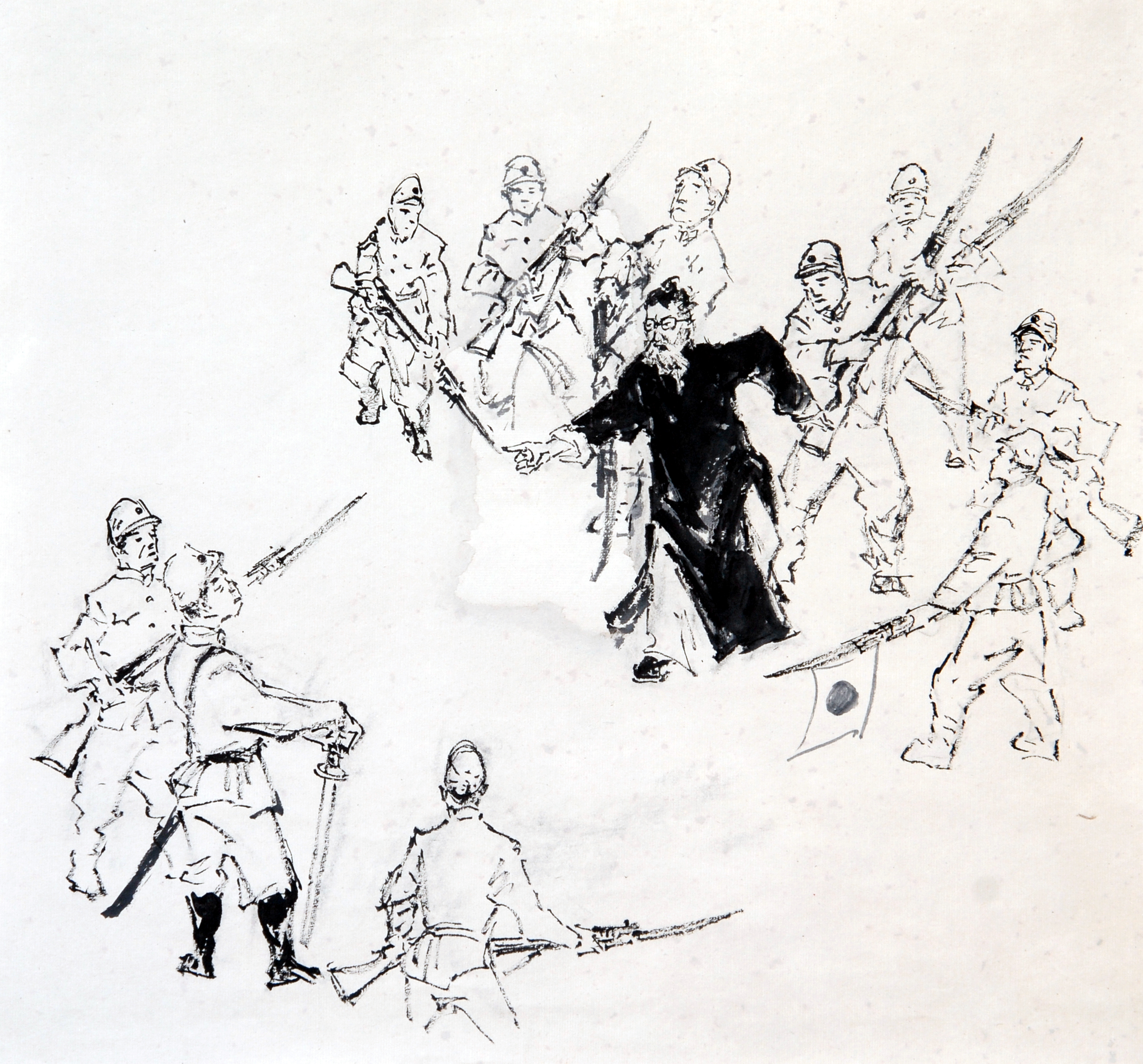 惠州畫家黃澄欽所作的《惠州老人助軍抗日誓死與城共存亡》之吳職藩痛罵日寇。侯縣軍 翻拍