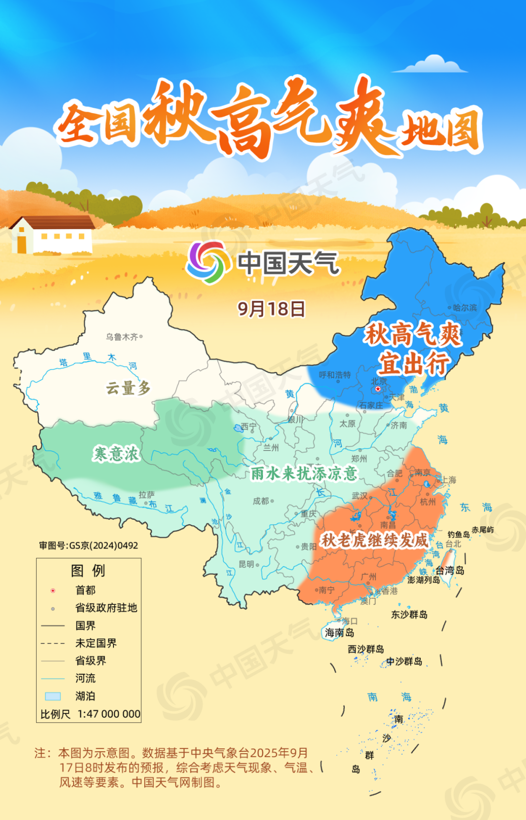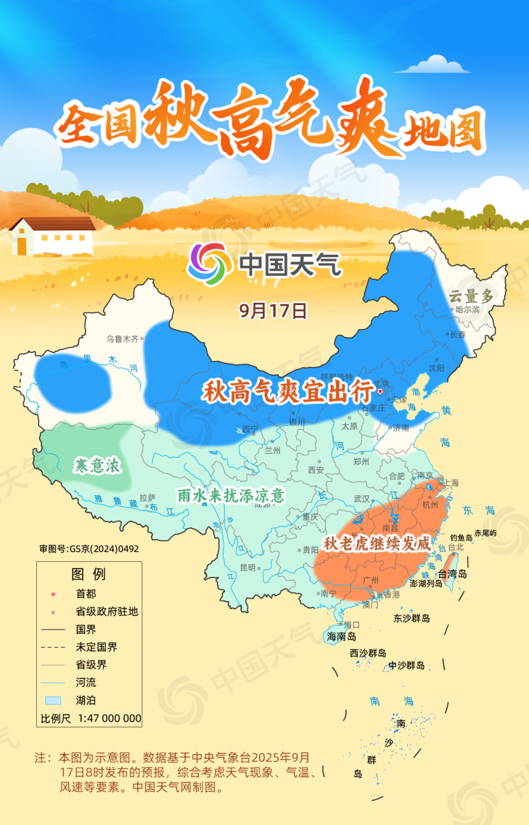 17日,北方多地天空放晴,風(fēng)力不大,云淡風(fēng)輕。東北地區(qū)、華北北部、西北地區(qū)東部等地屬于秋高氣爽的區(qū)域,這些地方以晴天為主,最高氣溫將在20℃至25℃左右,陽光在線,氣溫舒適,體感舒爽,正是出游好天氣。但在華西及長江沿線將有雨水來擾,特別是陜西、四川盆地等地的華西秋雨正盛,部分地區(qū)可能出現(xiàn)大到暴雨,外出需帶好雨具,注意交通安全。同時,江南多地秋老虎依舊兇猛,江西、湖南等地還將有成片高溫,需持續(xù)做好防暑降溫措施。