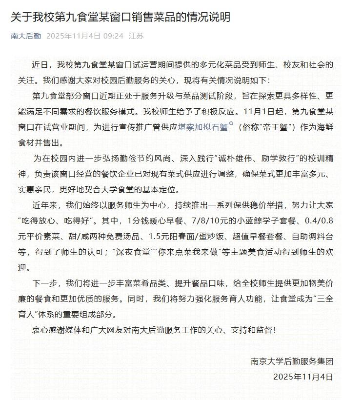 11月4日,南京大學(xué)發(fā)布情況說明:餐飲企業(yè)已對現(xiàn)有菜式供應(yīng)進(jìn)行調(diào)整,具體如下: