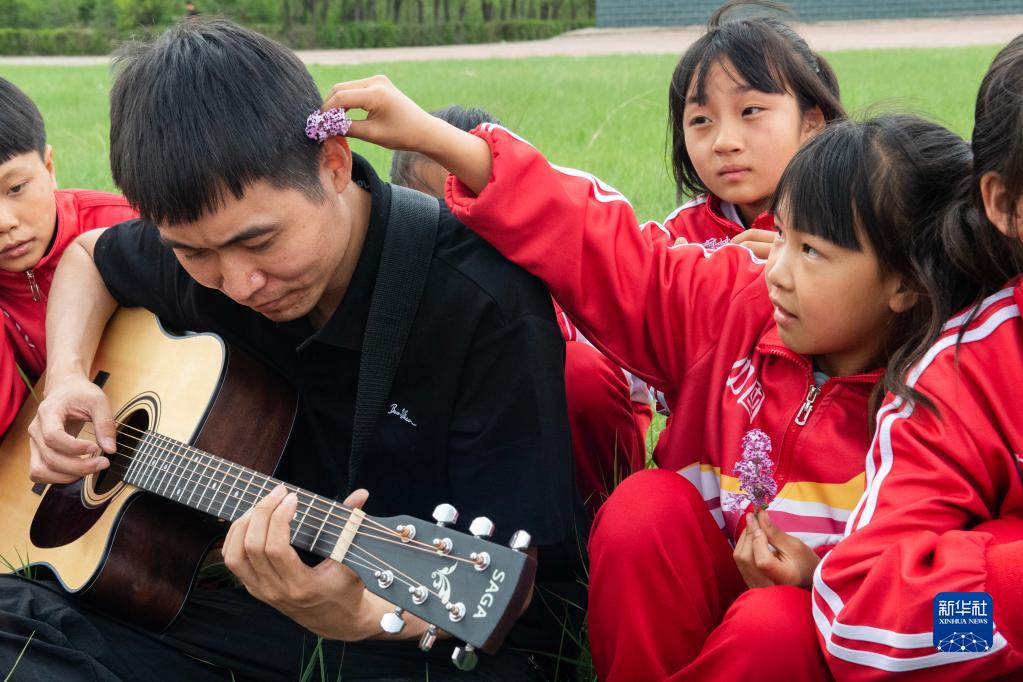 5月29日,在安達(dá)市任民鎮(zhèn)中心小學(xué)校園的草坪上,音樂(lè)班的孩子在練習(xí)合唱時(shí)把丁香花別在音樂(lè)老師李平的耳朵上。