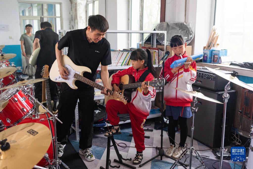 5月29日,在安達(dá)市任民鎮(zhèn)中心小學(xué),音樂(lè)老師李平指導(dǎo)音樂(lè)班的孩子進(jìn)行樂(lè)隊(duì)排練。