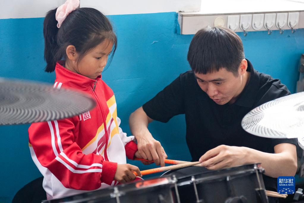 5月29日,在安達(dá)市任民鎮(zhèn)中心小學(xué),音樂(lè)老師李平(右)教音樂(lè)班的孩子打架子鼓。