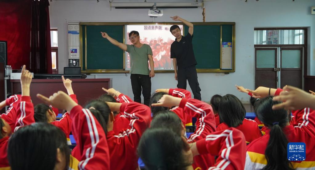 5月30日,在安達(dá)市任民鎮(zhèn)中心小學(xué),音樂(lè)老師李平(右)和張雨在教室內(nèi)指導(dǎo)音樂(lè)班的孩子們練習(xí)唱歌。