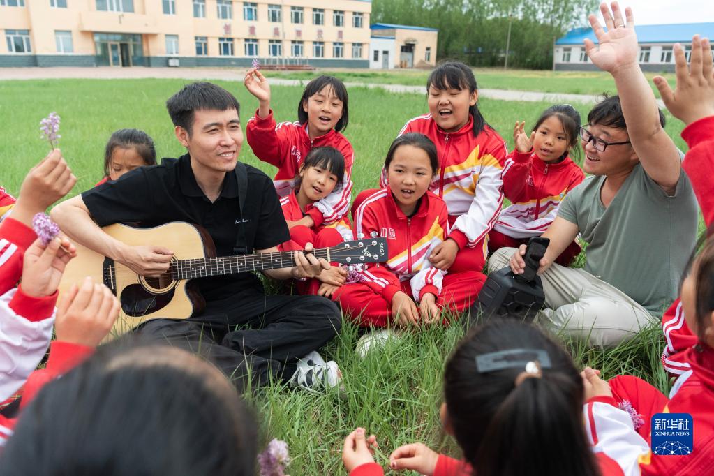 5月29日,在安達(dá)市任民鎮(zhèn)中心小學(xué)校園的草坪上,音樂(lè)老師李平(左一)和張雨與音樂(lè)班的孩子一起練習(xí)合唱。