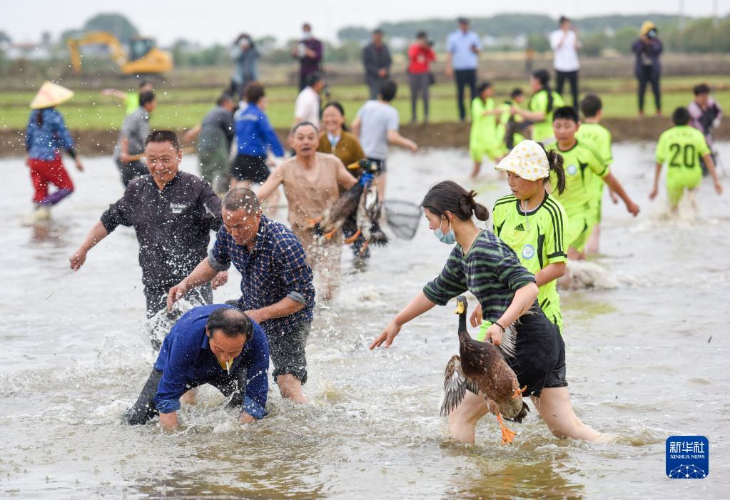 5月30日,在淮安市洪澤區(qū)岔河鎮(zhèn),人們在插秧節(jié)上參加抓鴨比賽。