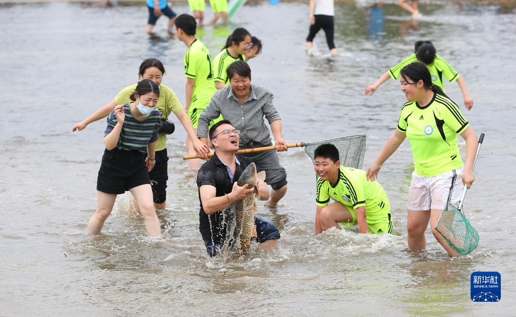 5月30日,在淮安市洪澤區(qū)岔河鎮(zhèn),人們在捉魚比賽活動現場。