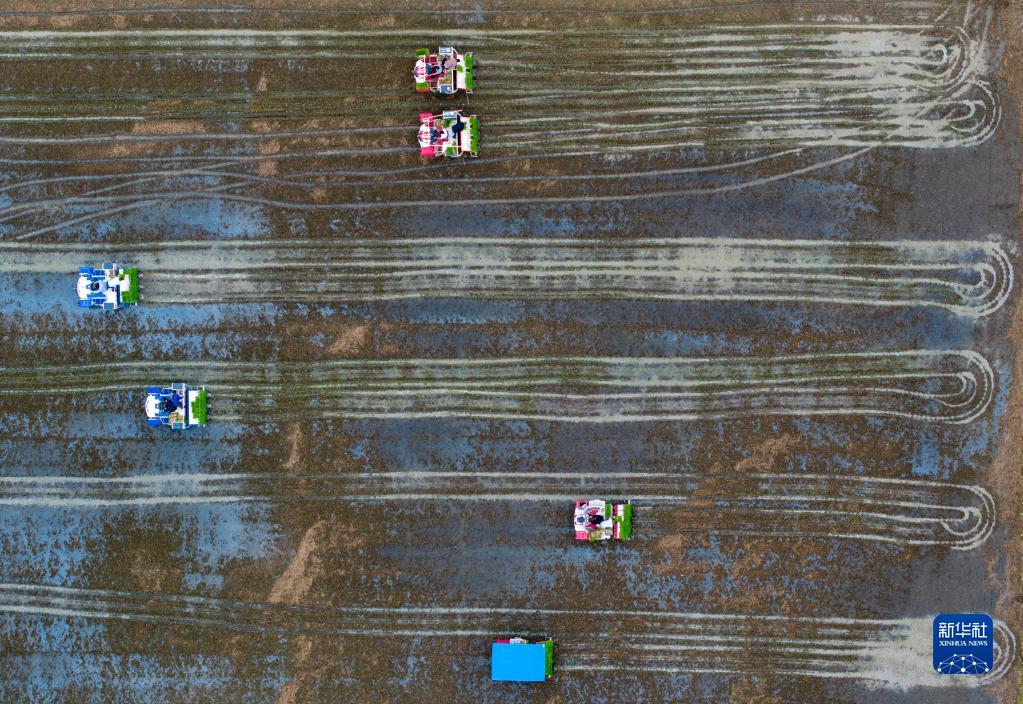 5月30日在淮安市洪澤區(qū)岔河鎮(zhèn)拍攝的機械插秧比賽(無人機照片)。