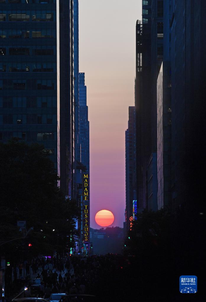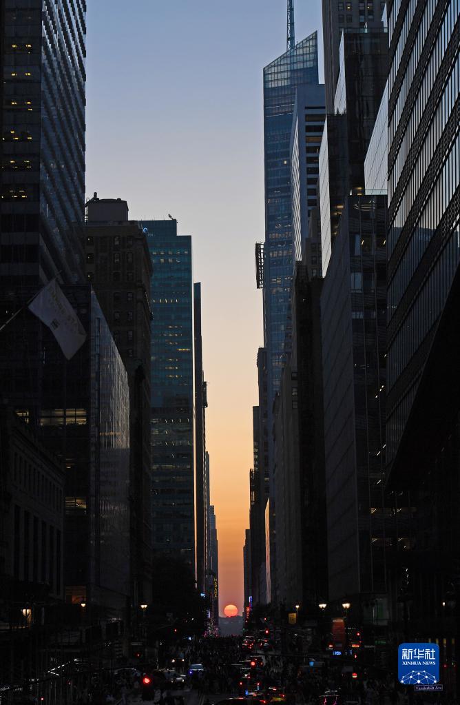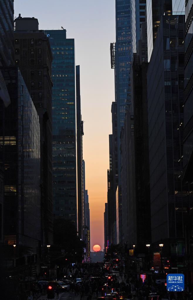 當日,紐約出現(xiàn)“曼哈頓懸日”景觀!奥D懸日”是紐約市標志性景觀,每年5月和7月出現(xiàn)兩次,指日落時太陽正好出現(xiàn)在曼哈頓東西向街道正上方、似乎懸在兩側(cè)高樓大廈之間的戲劇性畫面。