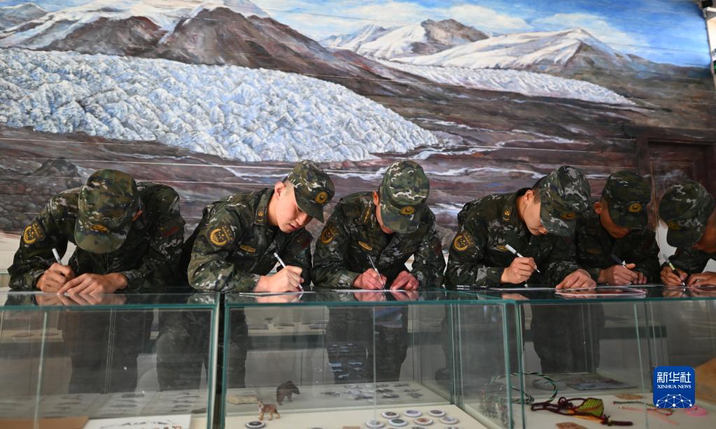 6月4日,武警青?傟牶N髦ш牴俦凇伴L江1號”郵局內(nèi)寫明信片,為家人送去來自長江源頭的祝福。